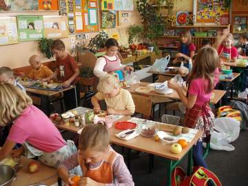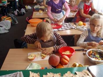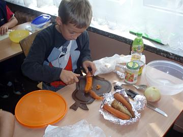 Zrobiliśmy kolejne ćwiczenia, które pomogły nam w lepszej koncentracji i twórczym myśleniu. Wykonywaliśmy szereg ciekawych owocowych i warzywnych zadań, a na koniec każdy z nas przygotował dla siebie i swoich bliskich sałatkę owocową lub warzywną z przy-niesionych przez siebie produktów. Praca ta pochłonęła nas bez resz-ty. Obieraliśmy, kroiliśmy, tarliśmy. Oczywiście cały czas pamiętaliśmy o higienie i bezpieczeństwie podczas pracy, ale się opłacało. Sałatki były pyszne.