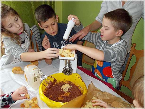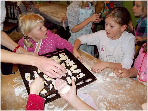 Uczniowie klasy 3a wraz z wychowawczyni� Bo�en� G�rn�–Setlak zostali zaproszeni do domu rodzinnego swojego kolegi Kacpra Szczud�o i bardzo ch�tnie z tego zaproszenia skorzystali. Mama Kacpra — pani Anna Szczud�o z zawodu czeladnik ciastkarz postanowi�a podzieli� si� z nami swoimi kulinarnymi tajemnicami. Najpierw opowiedzia�a nam o swojej pracy, wyja�ni�a r�nic� mi�dzy cukiernikiem a ciastkarzem, zaznajomi�a z podstawowymi urz�dzeniami i narz�dziami, kt�re wykorzystuje si� w pracy, przypomnia�a o zasadach bezpiecznego korzystania z tych urz�dze� no i oczywi�cie o higienie w czasie pracy. Zaznajomi�a nas z przepisami na pyszne ciasteczka, kt�re mieli�my okazj� samodzielnie przygotowa� i upiec. By�y to popularne kulki zwane „ziemniaczkami”, dro�d�owe rogaliki z marmolad� a tak�e przepyszne �wi�teczne pierniki.