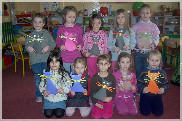 W czasie zajęć opowiadaliśmy w jaki sposób trzeba dbać o koty, oglądaliśmy różne zdjęcia kotów, poznaliśmy ich różne rasy i gatunki, dowiedzieliśmy co lubią robić i jeść, rozwiązywaliśmy „kocie zagadki”, rysowaliśmy koty wg instrukcji oraz wykonywaliśmy kociaki techniką orgiami. W podziękowaniu za bardzo ciekawe zajęcia zostawiliśmy pani Madzi kotki z masy solnej, które wykonywaliśmy na zajęciach plastycznych w szkole. (jd)