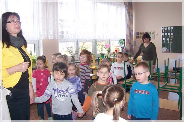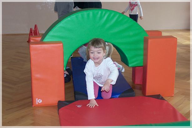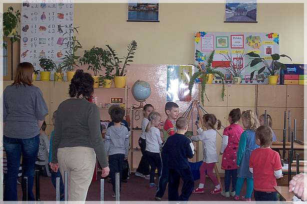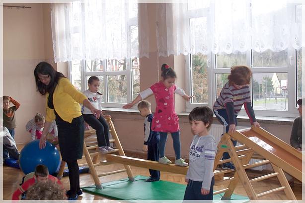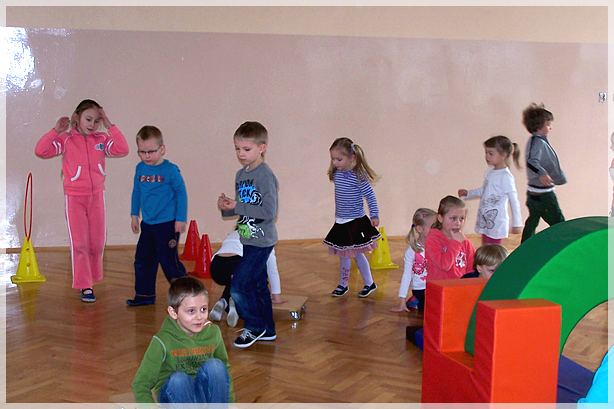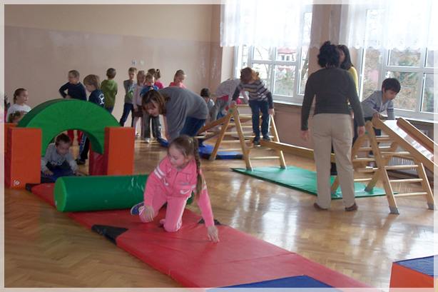 Następnie pokazaliśmy przedszkolakom sale lekcyjne pierwszoklasistów, w których duże zainteresowanie wzbudziła tablica oraz pomoce dydaktyczne. Po zwiedzeniu sal przeszliśmy na salę gimnastyczną, gdzie czekały na nas kolorowe materace, piłki, drabinki i tory przeszkód zbudowane z klocków gimnastycznych. Wesołym zabawom i ćwiczeniom nie było końca.