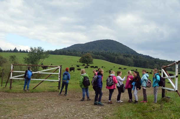 Naszą wspinaczkę rozpoczynamy w małej miejscowości Izby. Wysiadamy z autokaru przed gospodarstwem Końska Dolina. To gospodarstwo położone na 300 ha lasów, łąk i pastwisk, na których wypasane są zwierzęta: konie huculskie i arabskie, krowy, a także owce. My przechodzimy obok wybiegu dla ok. 60 koni. To robi na każdym z nas duże wrażenie. Kiedy będziemy wracać z Przełęczy Pułaskiego, spotkamy ogromne stado krów i byków. W naszych okolicach coraz rzadziej można spotkać krowę a my możemy podglądać wypas wielu dziesiątek krów i małych cieląt.